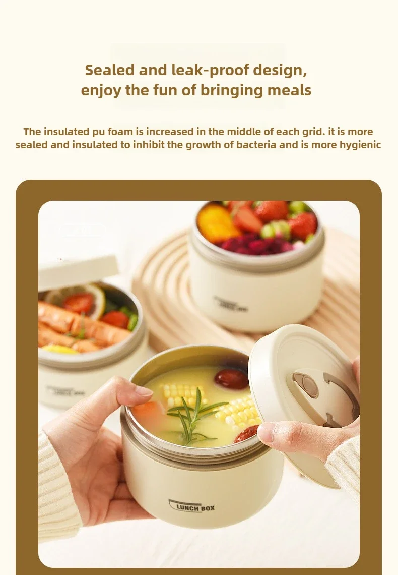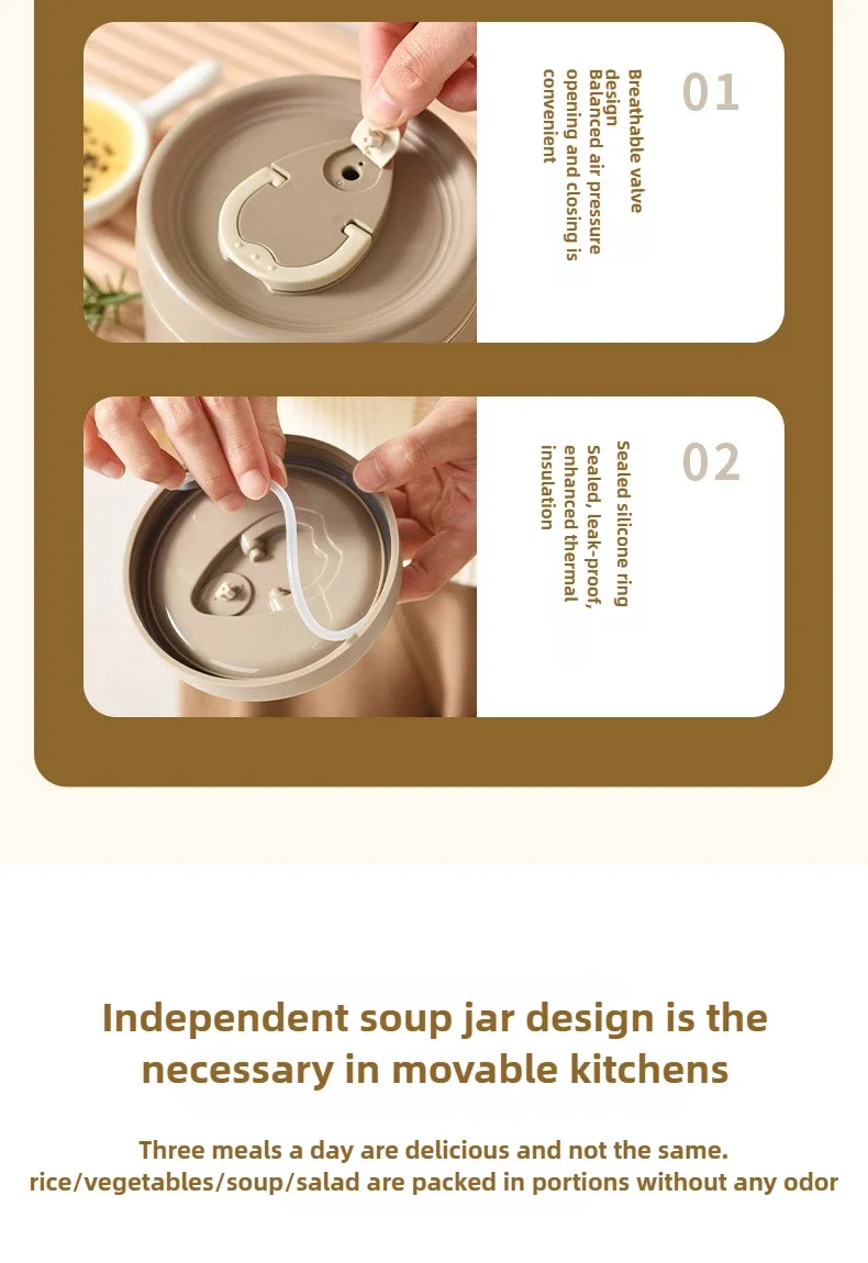 Each thermal lunch box has a separate lid. There is a built -in sealing silicone ring on the lid to prevent the sauce and soup from overflowing. There is an exhaust valve on the top of the lid, which can discharge the air in the container at any time, making the lunch box easier to open.